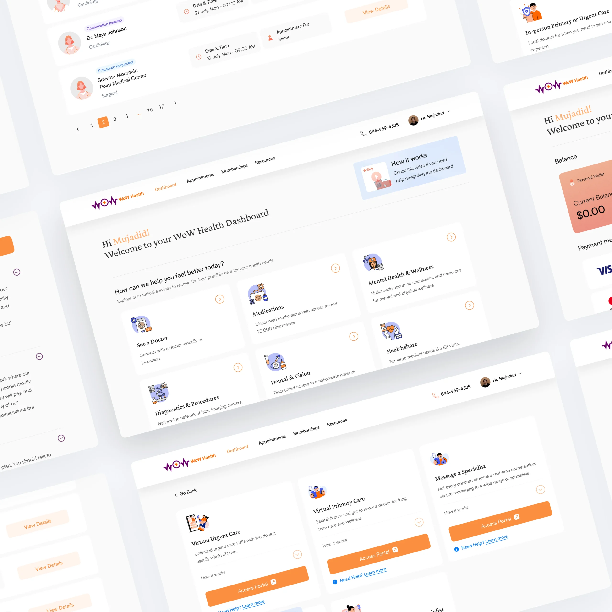 As the UI/UX Designer on the project, I was responsible for enhancing the user experience across WoW Health’s digital ecosystem. My primary focus was to ensure design consistency, address usability issues reported by users, and continuously improve the platform’s interface to support seamless operations for both web and mobile users and to create a seamless experience across web and mobile for key user flows (e.g., booking telehealth, pharmacy access, browsing procedures).